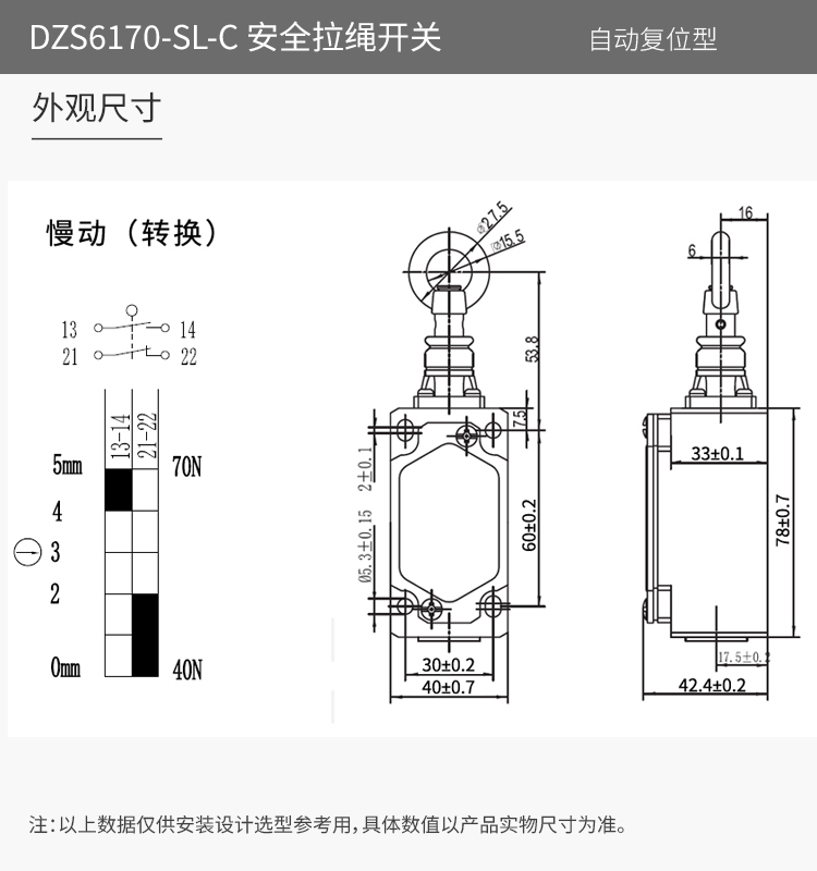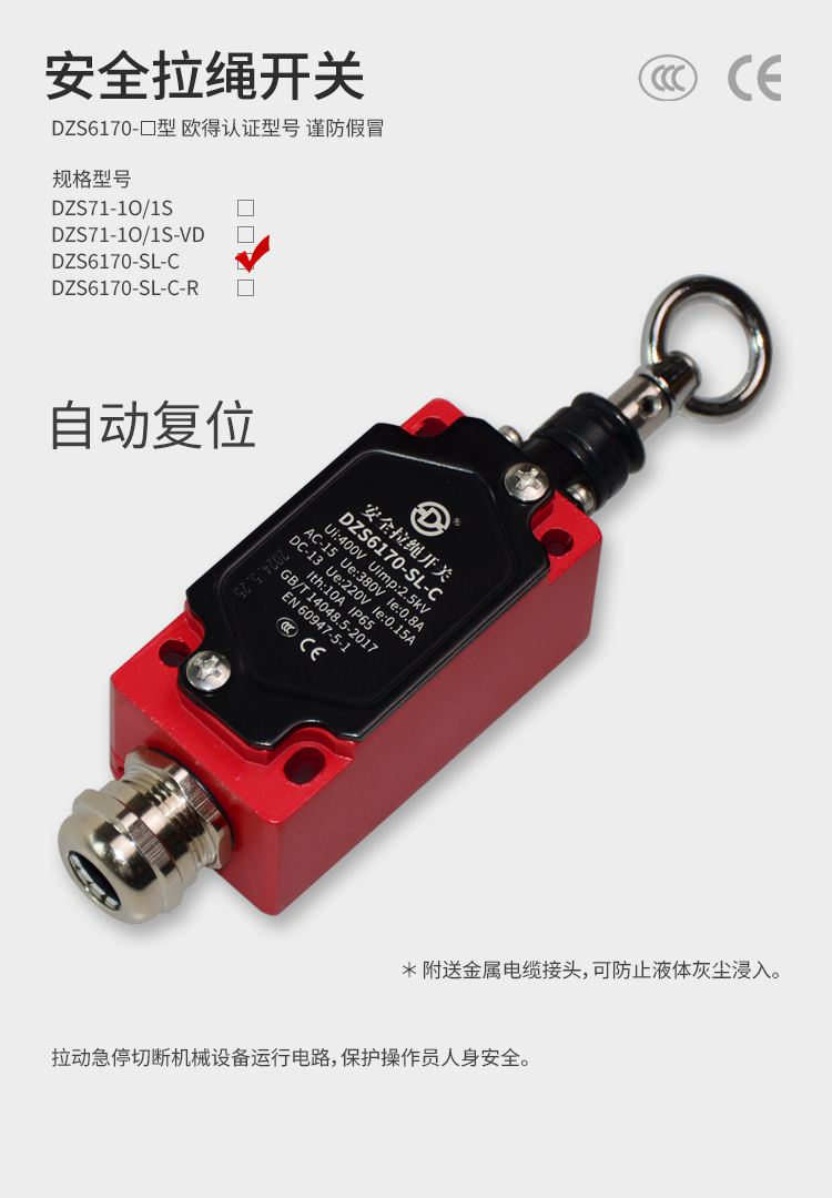 • DZS6170-SL-C安全拉繩開(kāi)關(guān),拉動(dòng)式、自動(dòng)復(fù)位型。默認(rèn)接點(diǎn)為2回路(1常開(kāi)1常閉)、可定制非標(biāo)2常閉(2NC)。金屬殼體,堅(jiān)固耐用。適用于流水線、輸送帶、高空作業(yè)車(chē)等機(jī)械設(shè)備位移信號(hào)控制,保護(hù)操作員不受機(jī)器傷害。額定絕緣電壓400伏,發(fā)熱電流10安培,工作電壓交流380伏、電流0.8安培,直流220伏、電流0.15安培,防護(hù)等級(jí)IP65,戶(hù)外使用請(qǐng)注意防水措施。
