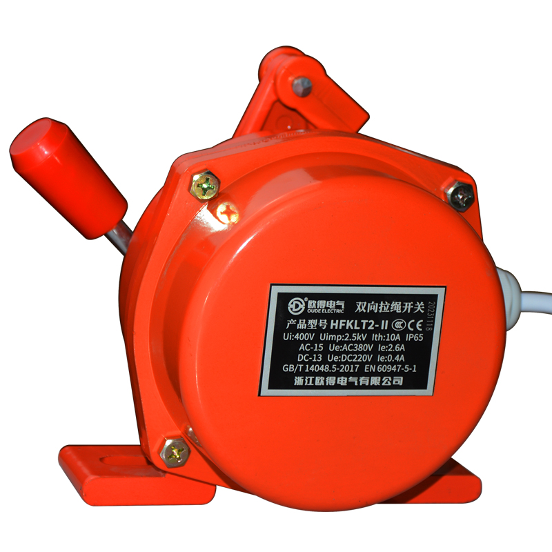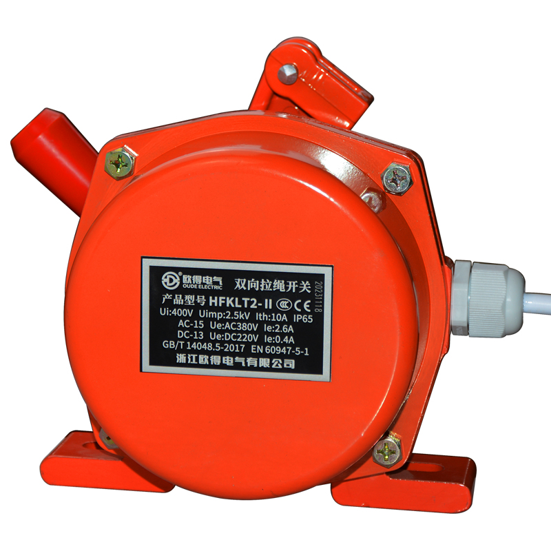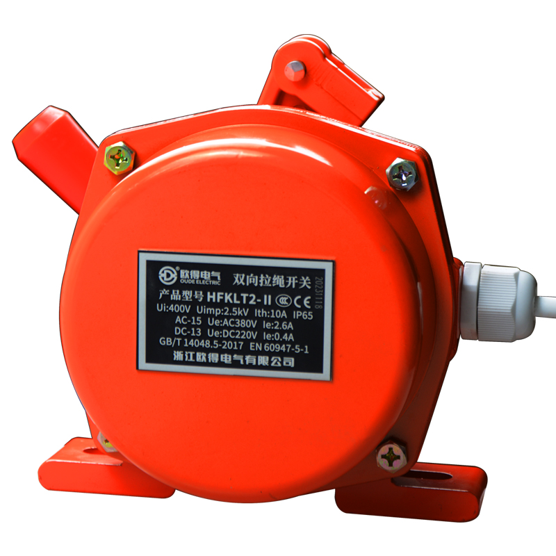 HFKLT2-Ⅱ雙向拉繩開關(guān),是用于膠帶運輸機現(xiàn)場,緊急事故停機的一種保護(hù)裝置。當(dāng)緊急事故發(fā)生時,在現(xiàn)場任意處啟動拉繩開關(guān),均可發(fā)出停機信號。絕緣電壓400伏,發(fā)熱電流10安培,工作電壓電流交流380伏、2.6安培,直流220伏、0.4安培,防護(hù)等級IP65。